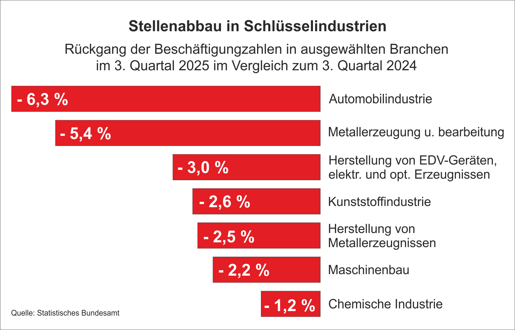 Zum Ende des dritten Quartals 2025 waren in dieser Branche rund 48.700 Personen weniger beschäftigt als im Vorjahreszeitraum, was einem Rückgang von 6,3 Prozent entspricht. Damit verzeichnet die Branche den stärksten prozentualen Beschäftigtenrückgang innerhalb der großen industriellen Sektoren Deutschlands. Mit insgesamt 721.400 Beschäftigten erreicht die Branche den niedrigsten Stand seit dem zweiten Quartal 2011.