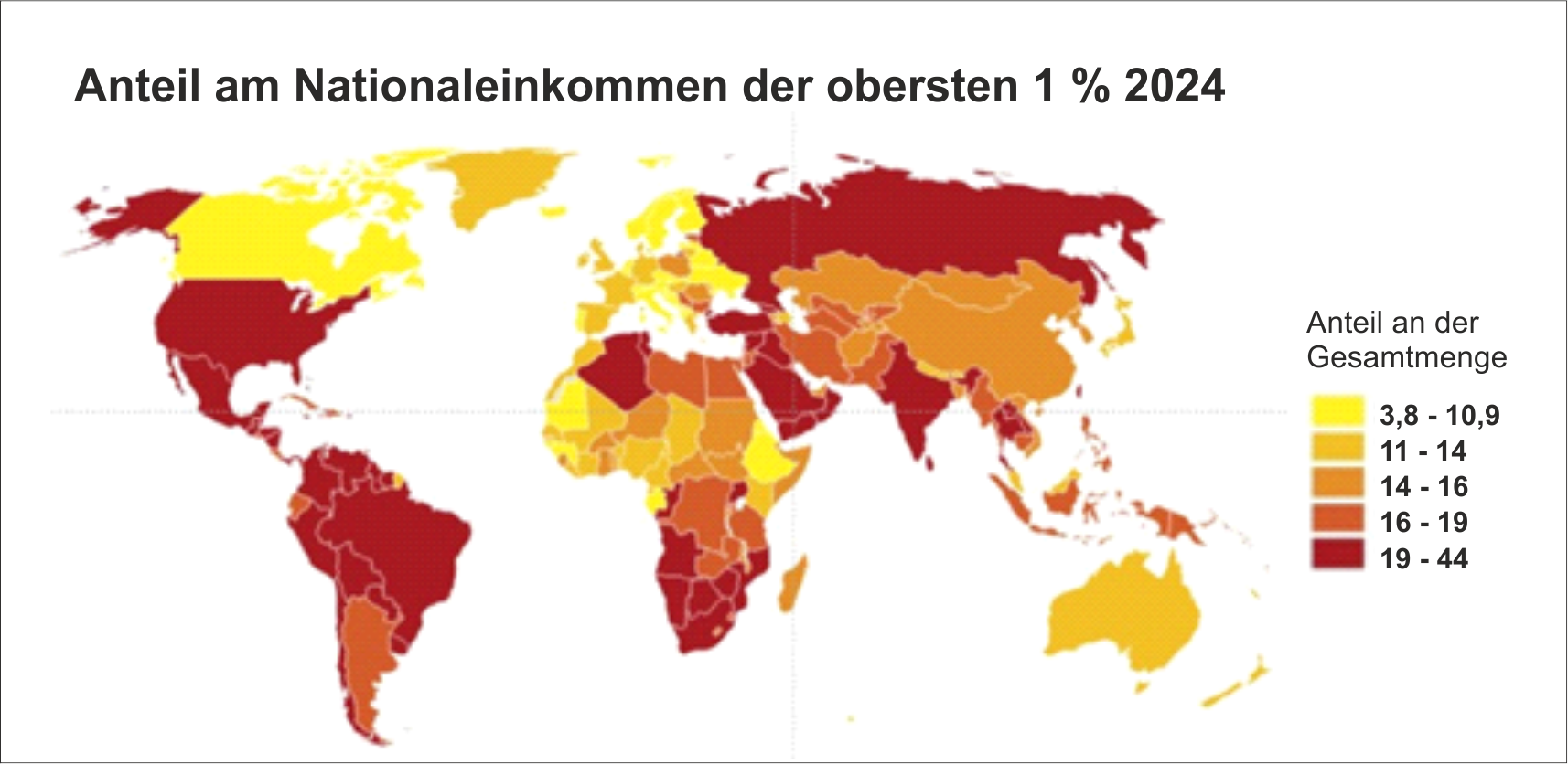 Der Weltungleichheitsreport 2025 bilanziert globale Einkommens- und Vermögensverteilung anhand umfassender Daten der World Inequality Database (WID). Ergänzt durch den Climate Inequality Report 2025 desselben Labors, verknüpft er ökonomische mit klimapolitischen Ungleichheiten. Theoretisch bestimmt der Report Ungleichheit als eine ungleich Verteilungsthematik: Das ungleiche Verhältnis von den obersten 10% gegenüber den unteren 50%“ scheint eine marxistische Klassenanalyse von Kapital vs. Lohnarbeit mit einem entsprechendem Klassenstandpunkt für politische Konsequenzen zu umgehen. Stattdessen gehen die Autoren davon aus, dass progressive Steuersysteme die Ungleichheit wirksam reduzieren könnten. Allerdings ist in diesem Kontext darauf hinzuweisen, dass die Steuerprogression in den reichen Ländern und vielen Schwellenländern seit Beginn der Phase des neoliberalen Kapitalismus (1970) eine gegenteilige Entwicklung nahmen, indem progressive Erbschaftssteuern ausblieben und ein reformistischer Ausbau von Sozialstaats– Maßnahmen, die den Kapitalismus „effizienter und gerechter“ machen sollten, theoretisch blieben und die soziale Ungleichheitsentwicklung nicht aufgehalten haben.