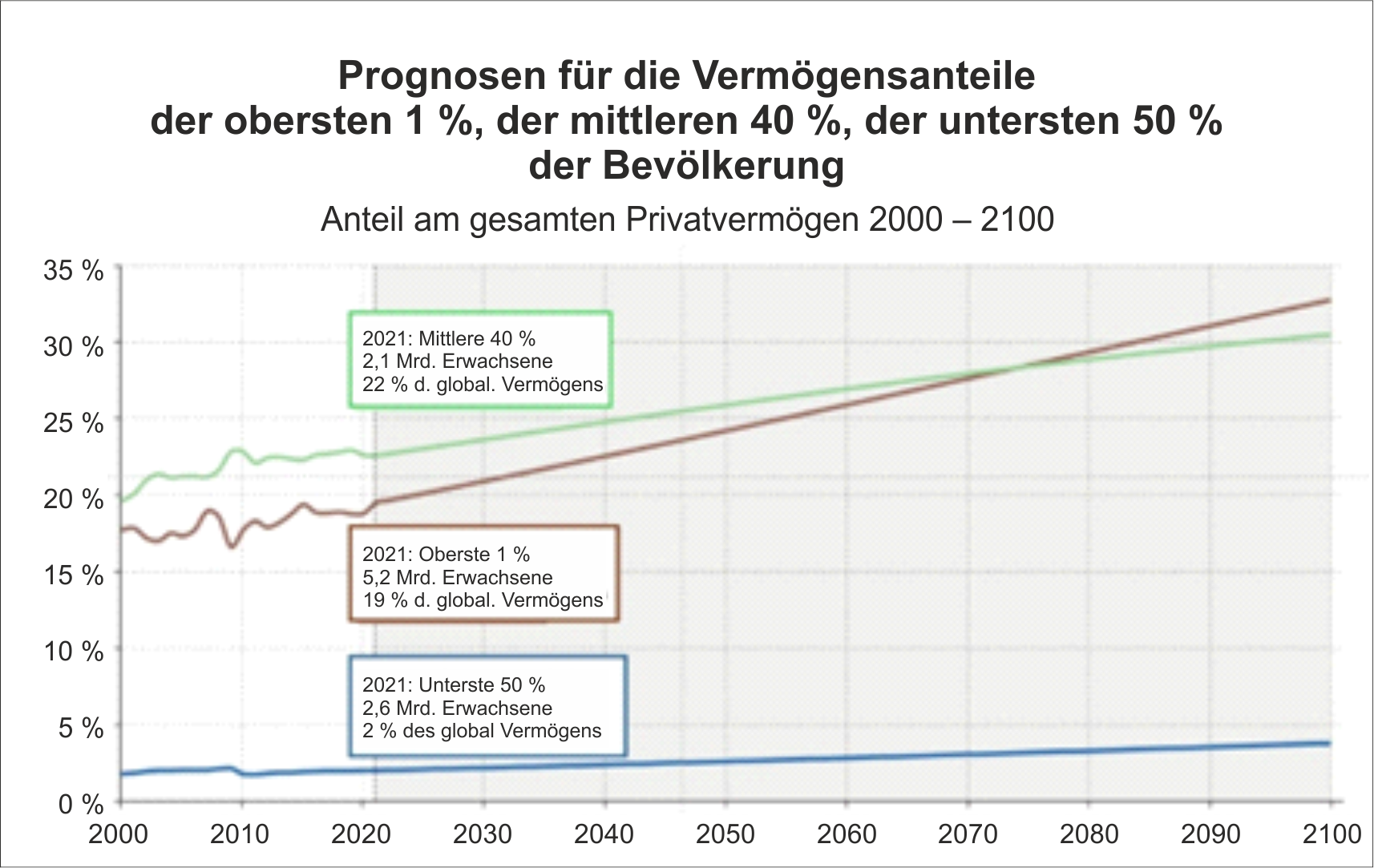 Die Vermögenskonzentration ist extrem: Die reichsten 10% der Weltbevölkerung besitzen 76% des globalen Vermögens. Die ärmere Hälfte der Weltbevölkerung verfügt über weniger als 5% des globalen Vermögens; in keinem Land ist dieser Anteil höher. Die obersten 0,1% der Vermögensbesitzer sollen ihren Anteil von rund 20% im Jahr 2022 auf über 30% bis zum Jahr 2100 ausbauen, was auf hohe Kapitalrenditen und bereits bestehende Vermögensberge zurückzuführen ist.