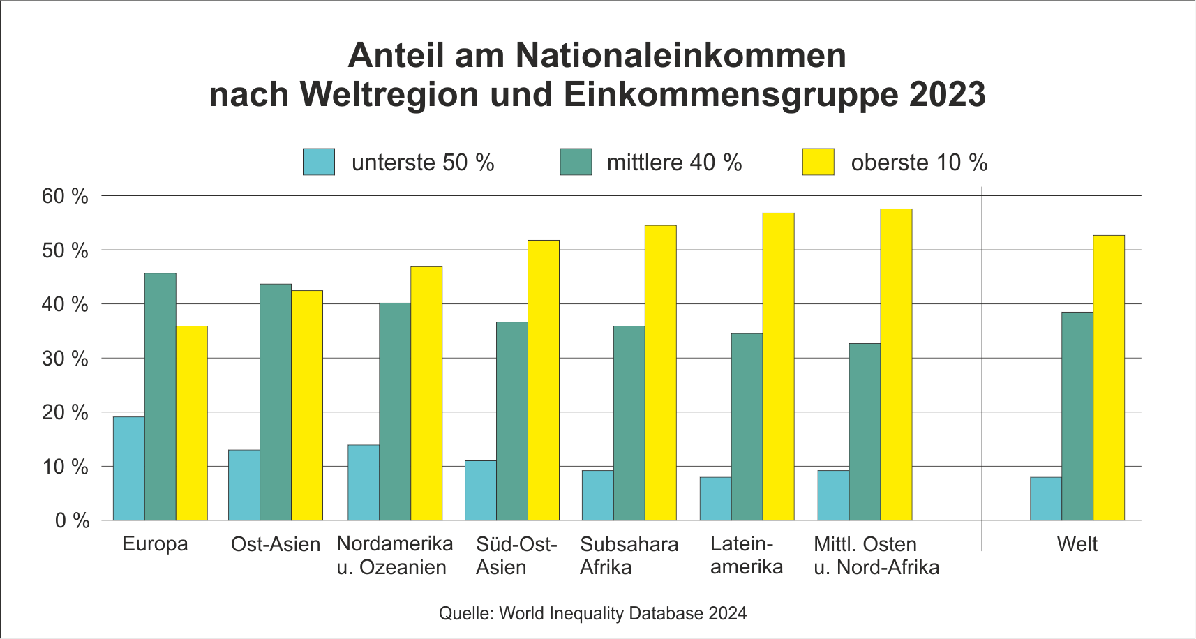 Für das Jahr 2023 zeigt die World Inequality Database, dass die Einkommensungleichheit zwischen den Regionen erheblich variiert. In Europa besitzen die obersten 10% etwa 37% des Gesamteinkommens, im Nahen Osten vergleichsweise sogar 61%. In Ländern wie Brasilien verdienen die oberen 10 % bis zu 29-mal mehr als die unteren 50 %, in Frankreich ist das Verhältnis 7 zu 1. Die Entwicklung ist in Schwellenländern besonders dynamisch, da dort die Deregulierung der Märkte und die Öffnung für globale Kapitalströme die Ungleichheit verstärkt haben. Zwischenstaatlich ist ein gewisser Aufholprozess großer Schwellenländer – etwa in Ostasien – erkennbar, was zur Abnahme der globalen Einkommensungleichheit zwischen Ländern beiträgt. Allerdings bleiben insbesondere Subsahara-Afrika und Teile Südasiens deutlich zurück, sodass die Einkommensschere im Weltsystem strukturell bestehen bleibt und künftige Verringerungen der Ungleichheit stark von der Entwicklung dieser Regionen abhängen. Im folgenden Schaubild sind die Anteile am Nationaleinkommen nach 6 Weltregionen und nach Einkommensgruppen dargestellt.