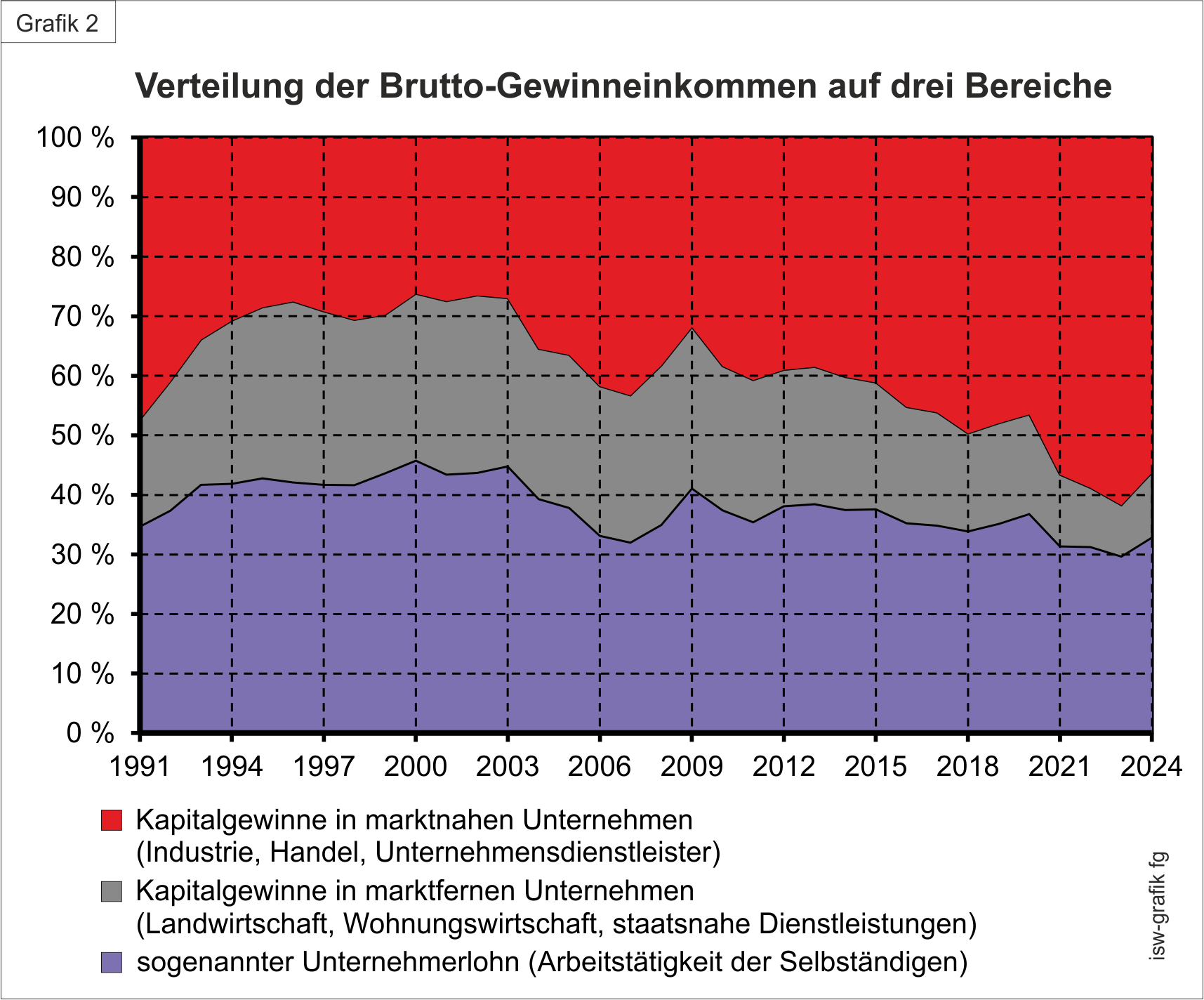 Grafik 1 zeigt die Aufteilung des Volkseinkommens in Lohn- und Gewinneinkommen und die daraus resultierende Profitquote seit 1991: Das ist der Anteil der Gewinneinkommen am Volkseinkommen.