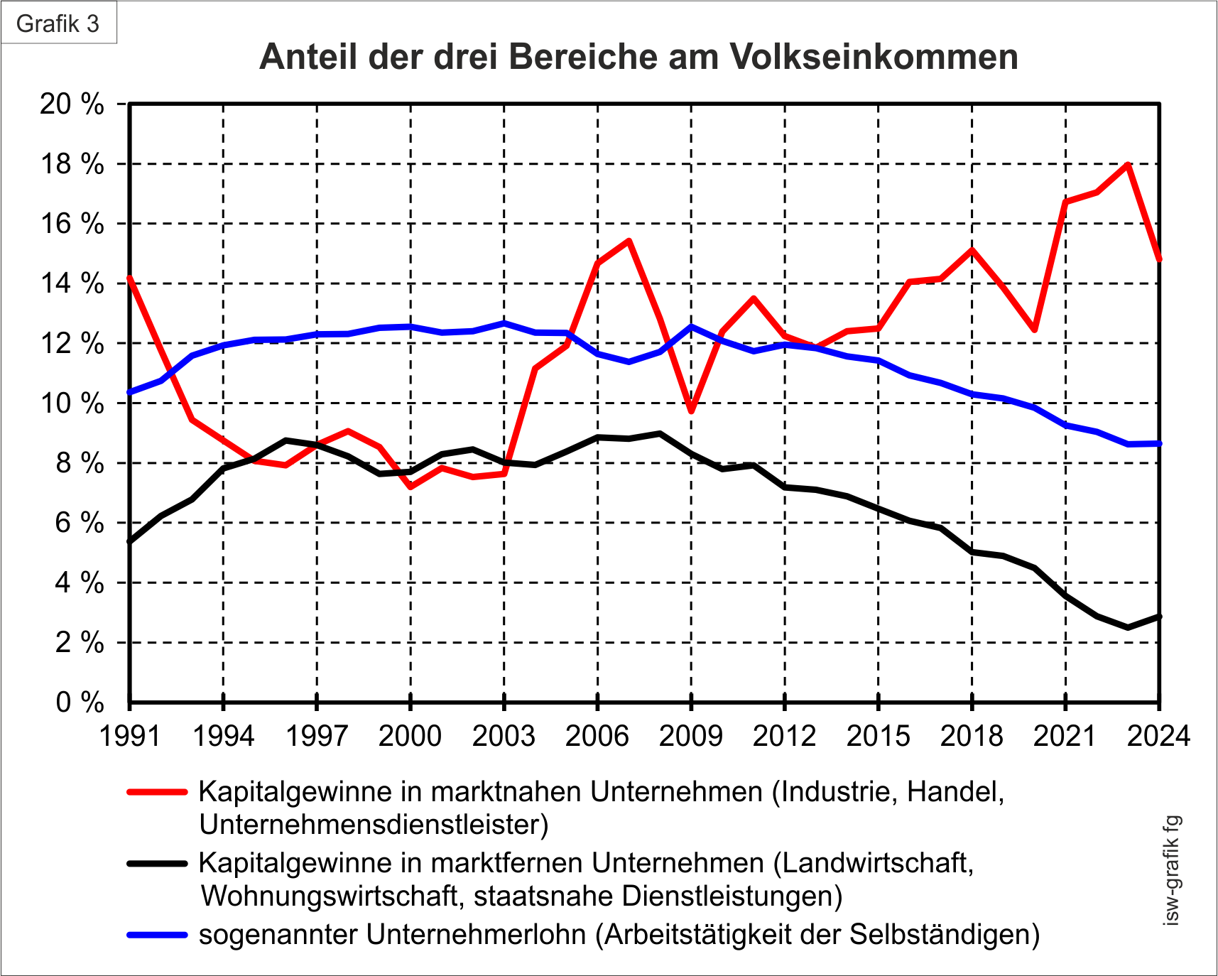 Noch deutlicher wird das totale Auseinanderlaufen dieser drei Einkommensgruppen in Grafik 3. Sie veranschaulicht den Anteil dieser Gruppen am Volkseinkommen. Wir erinnern uns: die Profitquote, also der Anteil aller drei Gruppen zusammen, sank. Hier wird deutlich, dass das Sinken der Profitquote eigentlich ausschließlich am Niedergang des Unternehmerlohns und der Kapitalerträge aus den marktfernen Bereichen resultiert. Dagegen die Profite aus dem Kernbereich der deutschen Konzernwirtschaft: sie steigen, mit heftigen Schwankungen zwar, aber ungebrochen in der Tendenz. Von einer Schwäche der deutschen Konzernwirtschaft kann nicht die Rede sein. Mit einer Einschränkung: In 2024 (und 2025) sinken die Konzernprofite laut amtlicher Statistik deutlich. Man muss abwarten, ob sich hier eine Art Selbstzerstörung der deutschen Wirtschaft durch Unfähigkeit abzeichnet: konkret am Beispiel der Autoindustrie das E-Auto-Hin&Her, was tendenziell zu einem Überlassen des künftigen Automarktes an chinesische Hersteller führt.