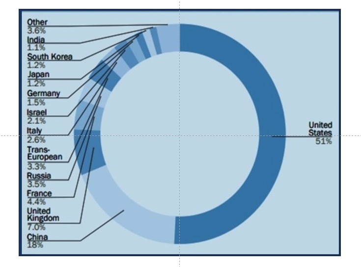 Dennoch bleiben die USA das waffenstarrendste Land auf der Erde: Bei nur 4% der Weltbevölkerung, kommen die US-Amerikaner auf 39 Prozent der Weltmilitärausgaben und 51 Prozent der gesamten Rüstungsgeschäfte der Top 100 Waffenfabriken. 42 der Top 100 Rüstungskonzerne haben ihren Sitz in den USA und bringen es zusammen auf 302 Milliarden Dollar Waffen-Verkäufe.