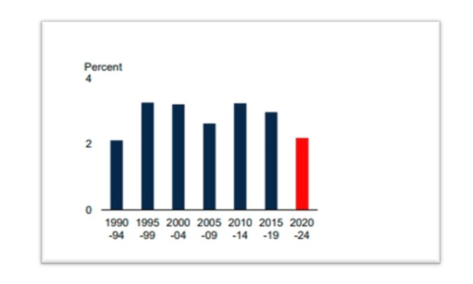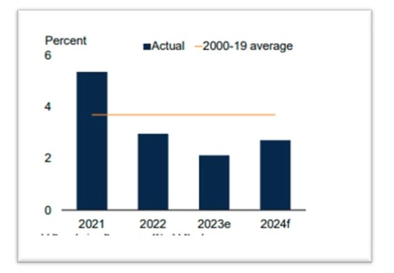 Die Weltbank geht davon aus, dass das BIP-Wachstum der Weltwirtschaft im Jahr 2024 nur noch 2,4 Prozent betragen wird - gegenüber 2,6 Prozent im letzten Jahr (und das schließt Indien, China, Indonesien usw. ein, die um 5-6 % wachsen werden). Dies wäre das dritte Jahr in Folge, in dem das Wachstum schwächer ausfallen würde als in den vorangegangenen 12 Monaten. "Ohne eine umfassende Kurskorrektur werden die 2020er Jahre als ein Jahrzehnt der verpassten Chancen in die Geschichte eingehen", sagte Indermit Gill, Chefökonom und Senior Vice President der Weltbank.