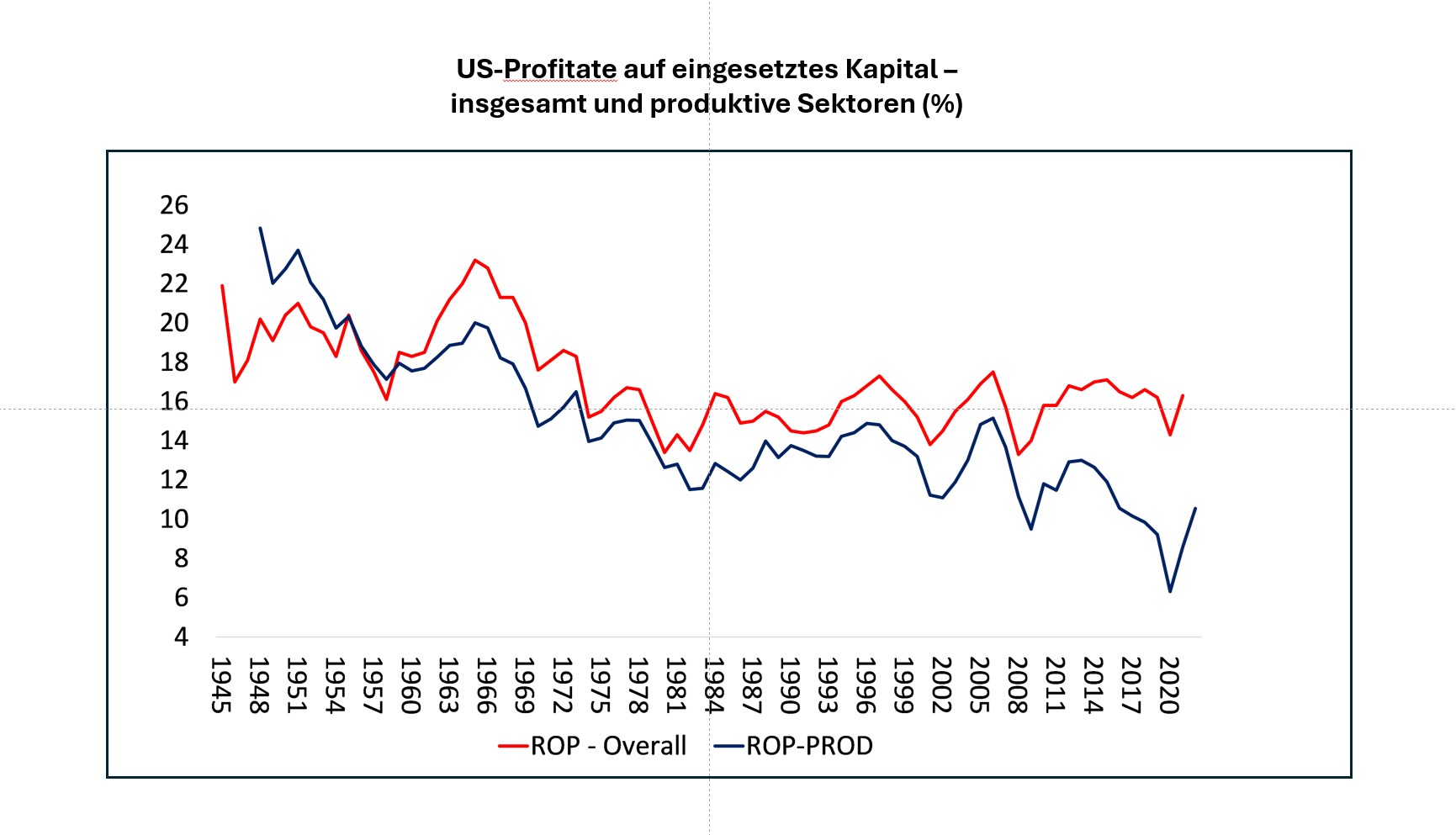 Der große Vorteil der F&K-Studie besteht darin, dass sie eine Profitrate auf der Grundlage der produktiven Sektoren der Volkswirtschaften erstellen kann. In der marxistischen Theorie sind es nur diese Sektoren, die durch Kapitalinvestitionen neuen Wert schaffen und nicht nur bereits geschaffenen Wert umverteilen. Es ist also die Profitrate in diesen produktiven Sektoren, die am besten die Gesundheit und die Richtung der kapitalistischen Wirtschaft anzeigt, da die Profitrate in den nicht-produktiven Sektoren (Finanz-, Einzelhandels-, Gewerbe- und Immobiliensektor) letztlich von der Profitrate in den wertschöpfenden produktiven Sektoren abhängt.