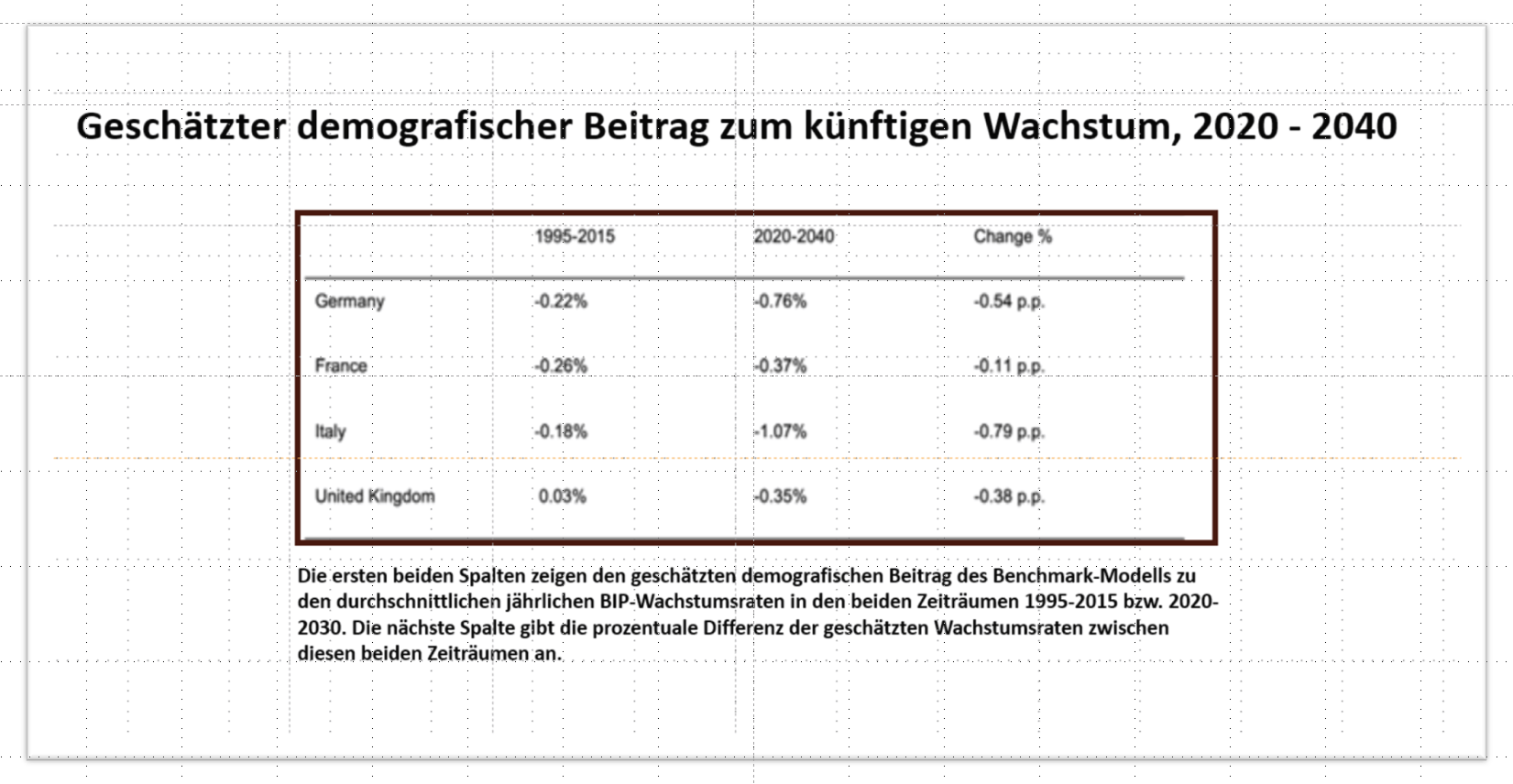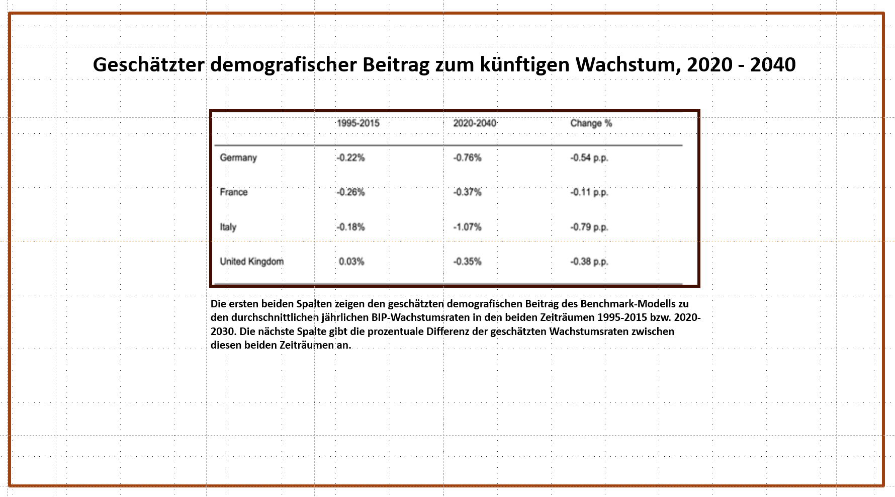 Der Rückstand beim Produktivitätswachstum ist für die Zukunft des europäischen Kapitals am schädlichsten. Die EU tritt in die erste Phase ihrer Geschichte ein, in der das Wachstum nicht durch eine steigende Bevölkerungszahl unterstützt wird. Bis 2040 wird die Zahl der Erwerbstätigen voraussichtlich um fast 2 Millionen pro Jahr zurückgehen. Der Bericht geht zwar nicht darauf ein, aber eine neue Studie kommt zu dem Schluss, dass die alternde Bevölkerung in Europa „massiven Gegenwind für das Wirtschaftswachstum verursachen wird“. Während der demografische Wandel in der Vergangenheit positiv zum Pro-Kopf-Wirtschaftswachstum beigetragen hat, wird er in den kommenden Jahrzehnten die Wachstumsrate der G4-Volkswirtschaften in Europa um 0,3 bis 1 Prozentpunkt pro Jahr verringern.