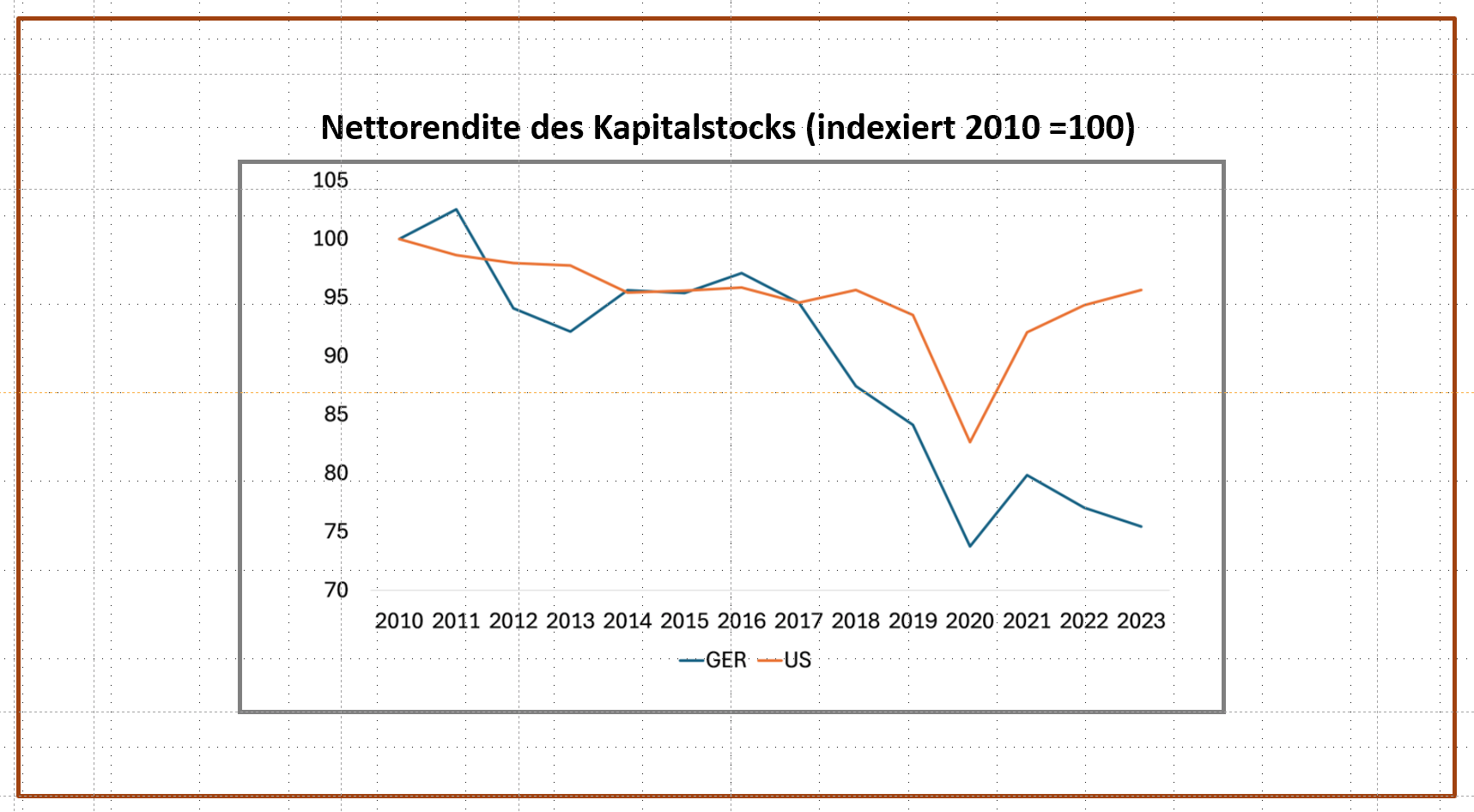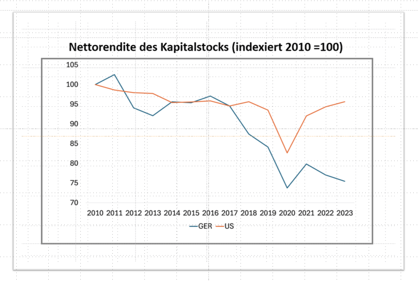 Aber sind die ineffizienten EU-Kapitalmärkte die Ursache für die geringeren produktiven Investitionen in Europa? Der Bericht deutet die wahre Ursache an, indem er aufzeigt, dass die privaten Finanzierungskosten zu hoch sind im Vergleich zu den Erträgen, die der kapitalistische Sektor der EU benötigt, um produktive Investitionen zu steigern, im Gegensatz zu Investitionen in Immobilien oder Finanzanlagen. Die eigentliche Ursache liegt in der geringeren Rentabilität des europäischen Kapitals im Vergleich zu den USA. Dies ist insbesondere seit 2017 der Fall (in diesem Beispiel unten für die amerikanische und deutsche Rentabilität).
