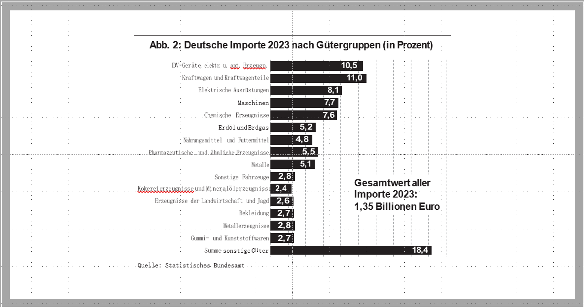 Von dem Muster, das Rohstoffe eingeführt und dann industrielle bearbeitet werden und diese Produkte dann ausgeführt werden, haben sich die deutschen Ein- fuhren schon lange entfernt. Natürlich werden auch weiterhin Rohstoffe impor- tiert, da Deutschland als rohstoffarmes Land darauf angewiesen ist. Das ist aber nur ein relativ kleiner Teil. Selbst wenn man davon ausgeht, dass Rohstoffe zu relativ niedrigen Preisen gehandelt werden und deshalb – in Werten ausgedrückt – in der Handelsbilanz unterrepräsentiert sind, machen sie nur einen kleinen Teil der Importe aus. Die Struktur der Güter unterscheidet sich nicht wesentlich von der Struktur der Exportgüter. Gut die Hälfte der importierten Waren sind Produkte der wichtigen Industriebranchen DV-Geräte, elektrische und optische Erzeugnisse, Autoindustrie, elektrische Ausrüstungen, Maschinenbau und chemische Erzeugnisse.