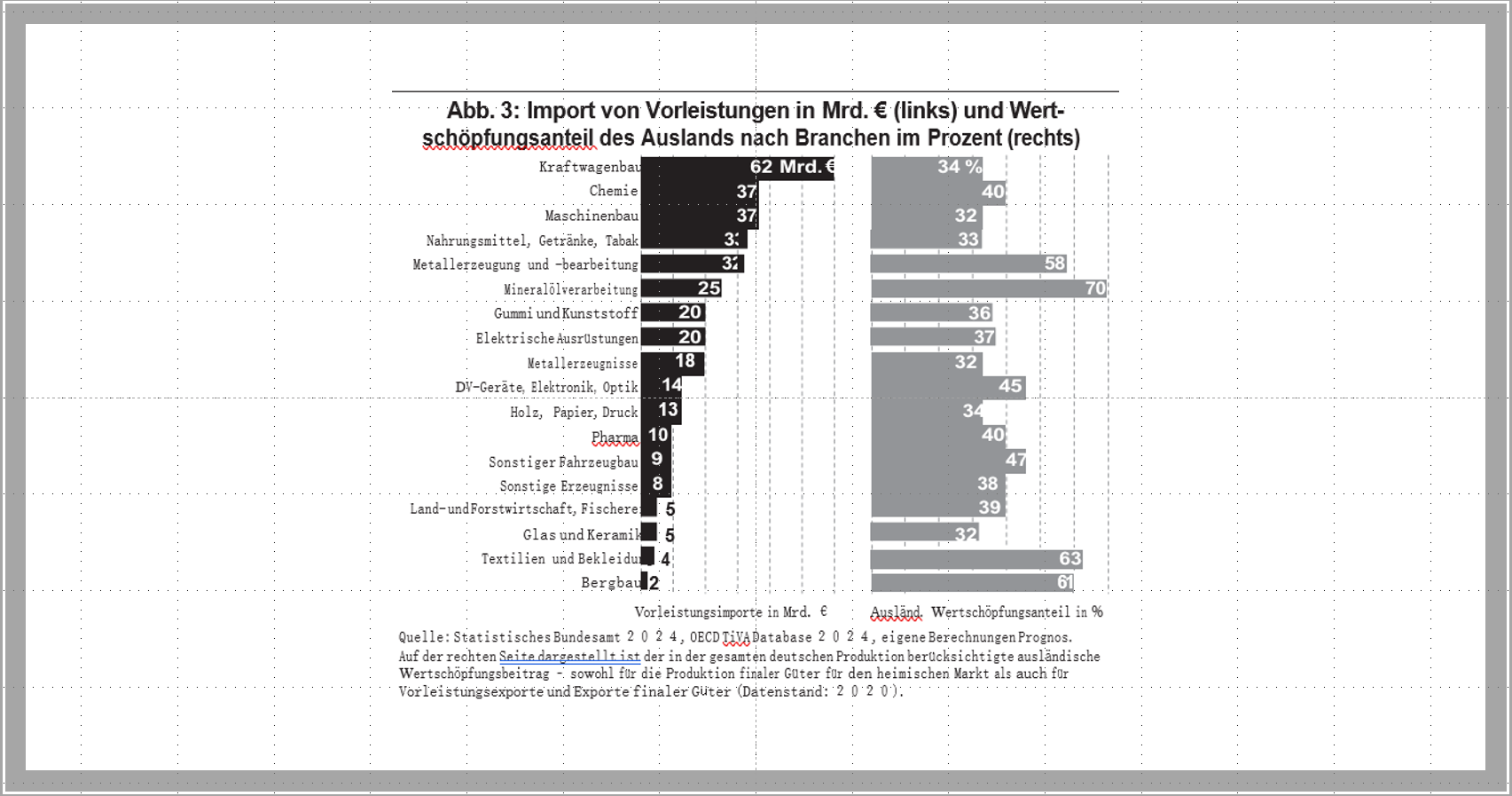 »Der überdurchschnittlich hohe Offenheitsgrad liegt unter anderem am ho- hen deutschen Importbedarf an Vorleistungsgütern für die weitere Verarbeitung in den industriellen Wertschöpfungsketten. Ein erster Überblick zeigt, dass einige Branchen besonders viele Vorleistungsgüter aus dem Ausland beziehen, die dann in ihren jeweiligen Produktionsprozessen weitere Verwendung finden. An der Spitze steht hier der Kraftwagenbau mit Vorleistungsimporten im Wert von mehr als 60 Mrd. Euro.« (Prognos 2024, 2)