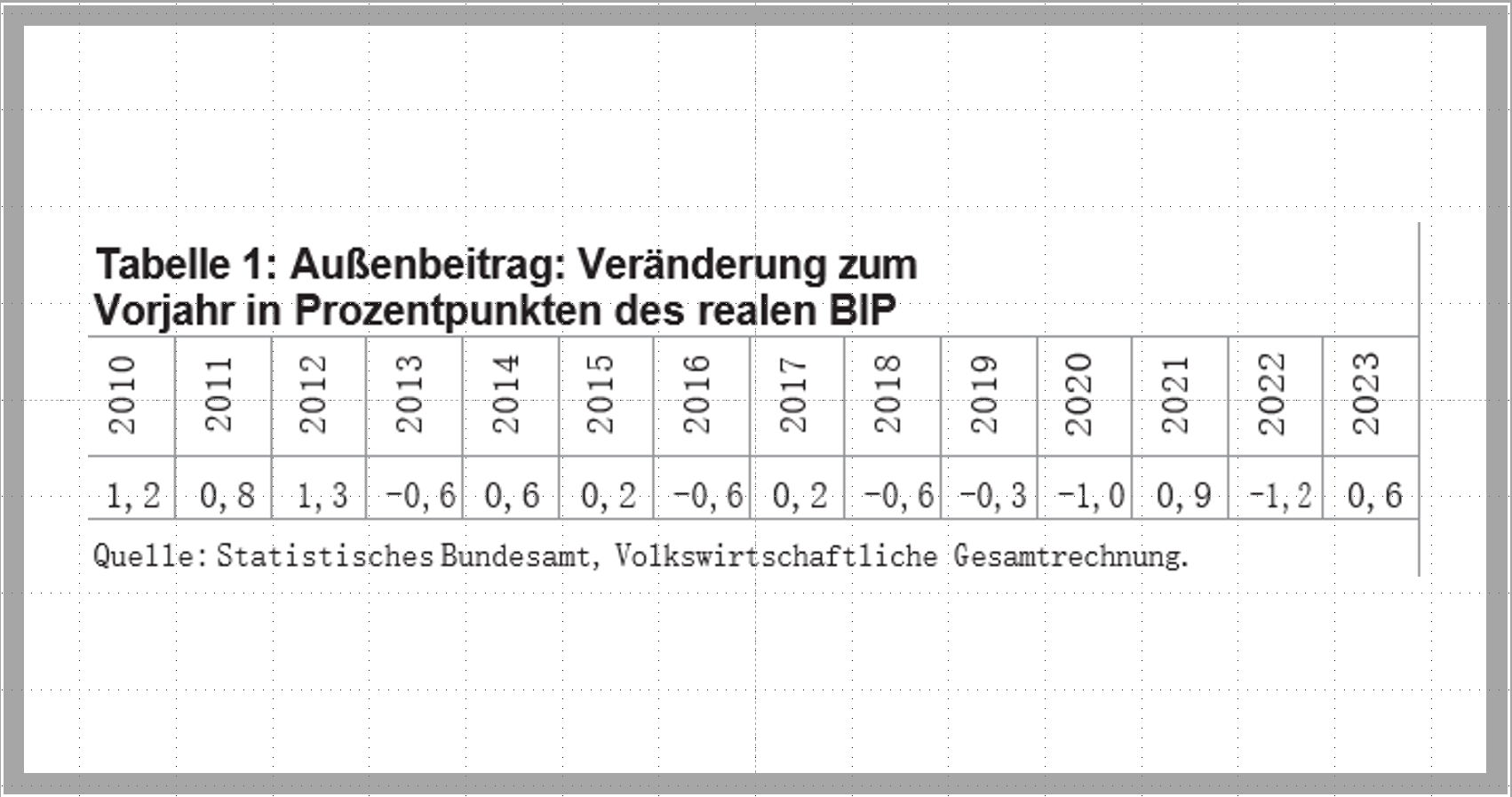 Damit wird der Umriss des deutschen »Geschäftsmodells« deutlich. Mit dem Import günstiger Konsumgüter und günstiger Energie wurde der Lebensstandard gesichert. Gleichzeitig haben niedrige Energie- und Rohstoffpreise sowie die Ein- fuhr von industriellen Vorleistungsgütern aus Staaten mit erheblich niedrigerem Lohnniveau die Wettbewerbsfähigkeit der Industrie gesteigert. Das hat zu den großen Exporterfolgen beigetragen und somit relativ gut bezahlte industrielle Arbeitsplätze gesichert und den exportierenden Konzernen hervorragende Profite beschert. Doch dieses Modell stößt schon seit längerem an seine Grenzen. Die unmittelbaren Wachstumseffekte aus den vielfältigen Außenhandelsverflechtungen lassen sich am Außenbeitrag ablesen. Diese Größe aus der Volkswirtschaftlichen Gesamtrechnung beschreibt den Anteil des Wachstums (oder des Schrumpfens), die sich aus den Exporten minus der Importe ergeben.