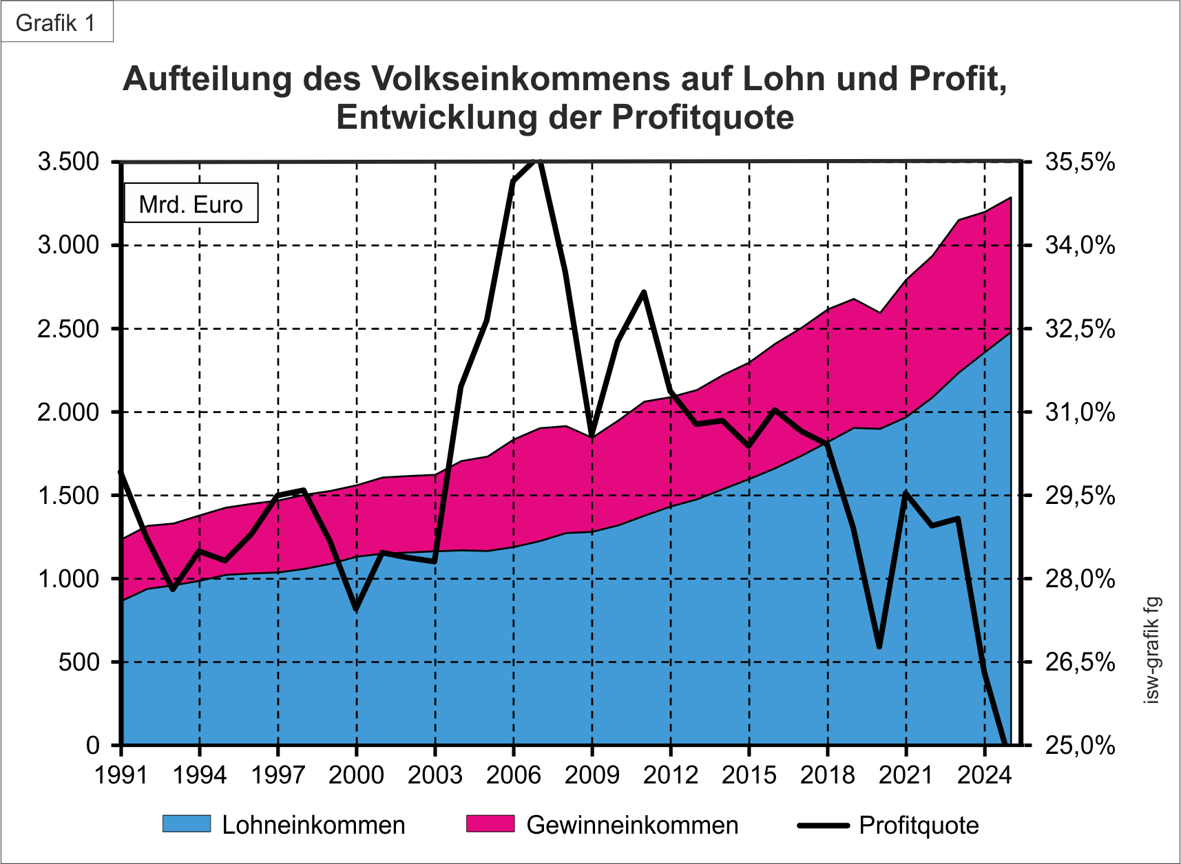 Grafik 1 zeigt die Aufteilung des Volkseinkommens in Lohn- und Gewinneinkommen und die daraus resultierende Profitquote seit 1991: Das ist der Anteil der Gewinneinkommen am Volkseinkommen.
