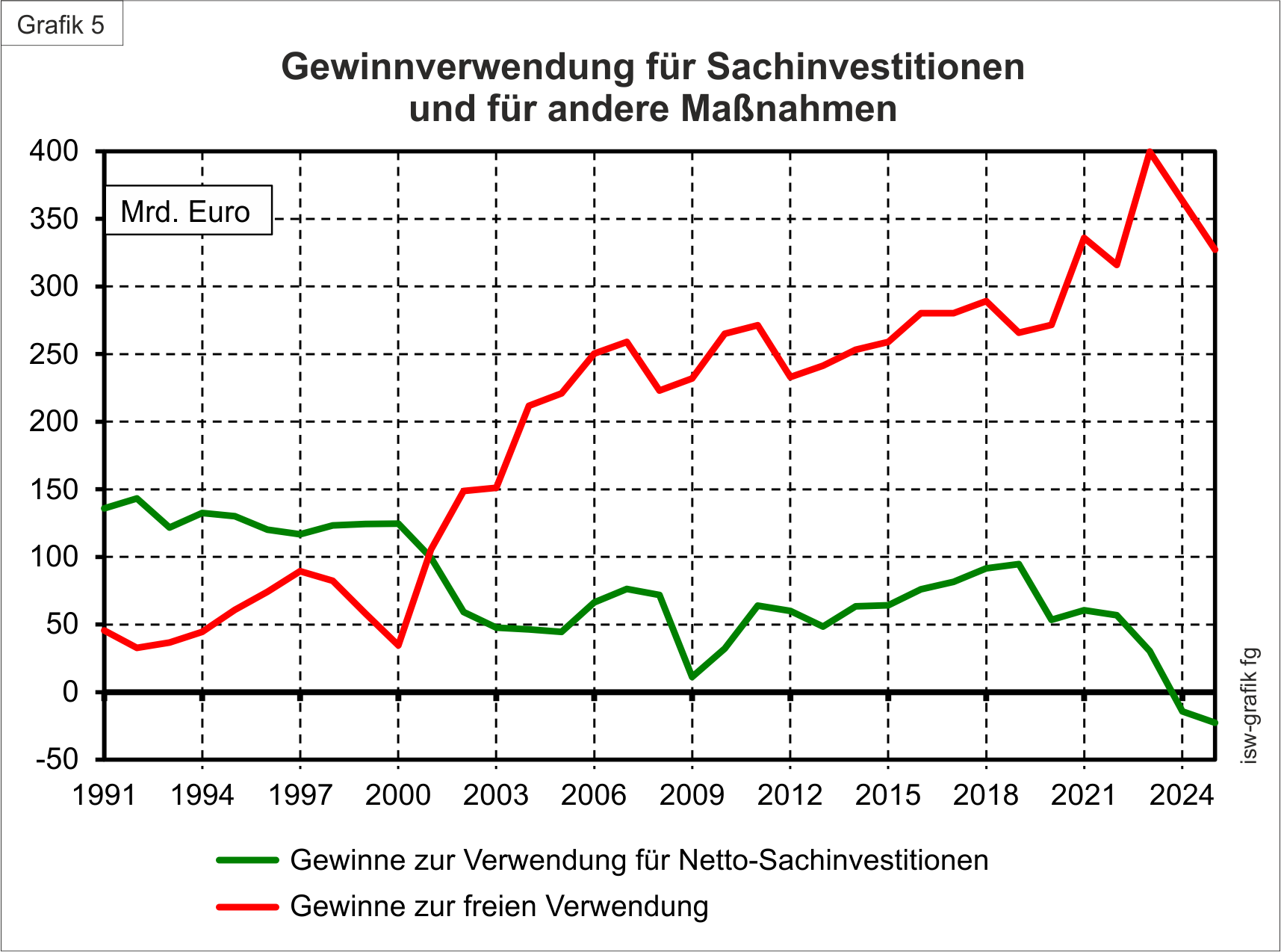 Jedenfalls: In den 1990er Jahren absorbierten die Nettoinvestitionen noch mehr als zwei Drittel der frei verfügbaren Gewinne nach Steuern und Individualkonsum. Seither ist der Anteil der Gewinneinkommen, der für Nettoinvestitionen ausgegeben wird, sehr viel niedriger und sinkt im Trend. Die Gewinne steigen, die Nettoinvestitionen fallen. Mehr noch: 2024 und gleich nochmal 2025 fielen die Nettoinvestitionen erstmals ins Negative: 37 Mrd. Euro gesamtwirtschaftliche Desinvestition in den beiden Jahren. Noch nie dagewesen seit Bestehen der Bundesrepublik!